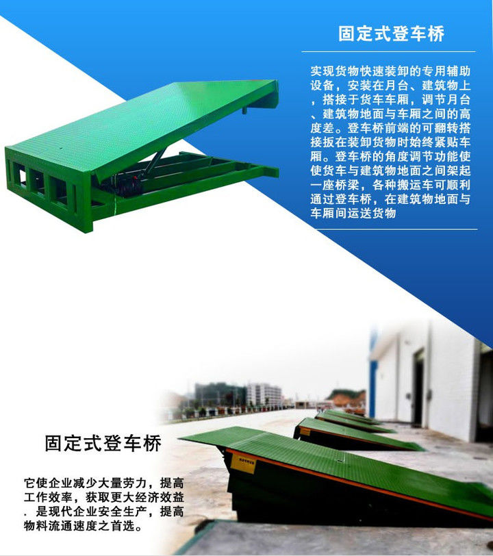 產(chǎn)品可根據(jù)用戶的不同需要,廣泛應(yīng)用于碼頭、站臺、倉庫等地。在外形尺寸,承受載荷等方面都可以作特殊設(shè)計。 固定式登車橋www.sdyxsjj.com安裝在貨臺的側(cè)面,與貨臺地面和側(cè)面齊平。固定式登車橋的橋板可上、下傾斜,其外端可高出或低于貨臺平面,使之與車廂等高。橋板的頂端有一翻板,自動搭在車廂邊緣,使貨臺與車廂平穩(wěn)過渡。