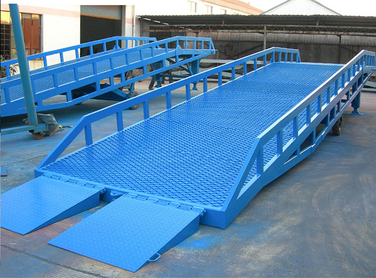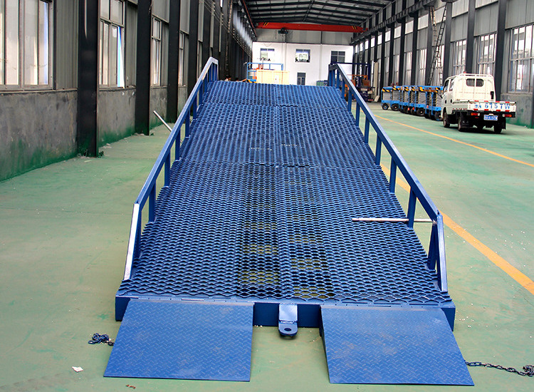 訂購電話:187-6641-6631移動式登車橋在現代物流現場已是一非常易見的結構形式,它是企業物流鏈的起點與終點,是企業快速、安全周轉產品及貨物的一個裝卸貨操作平臺。 裝卸貨操作平臺的高度固定,但來往運輸車廂的廂地高度不一,運輸車輛與裝卸貨站臺之間總是形成一定的高度落差或間隙。造成搬運叉車不能進出運輸車輛直接裝卸貨物。運用登車橋提供可靠的連接。使搬運叉車能夠安全、快速地進出運輸車輛進行裝卸貨作業。使用過程平穩可靠,安全性能高,裝卸貨物時節約了大量時間,省卻了大量人力,使裝卸貨物大大的提高了效率。臺面采用特制的菱形網格板有可靠的強度,能保證長期使用而不變形。它的菱形網狀結構,充分保證了卓越的防滑性能,使叉車有更好的爬坡性和可操縱性,即使在雨、雪天氣,仍能保證正常使用。