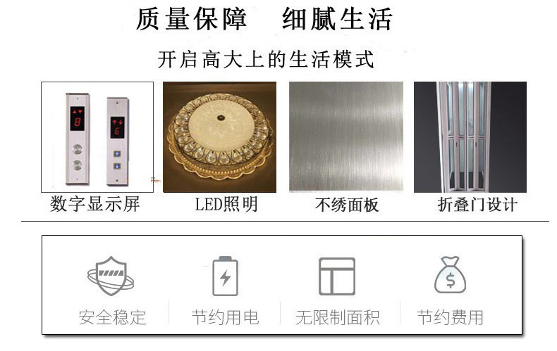 曳引家用電梯或別墅電梯:井道及地坑、轎廂、層站部分;主要部件:曳引系統、導向系統、門系統、轎廂、重量平衡系統、電器控制系統、安全保護系統,電氣方面的安全保護在電梯的各個運行環節都有,這種電梯同小區電梯相同。安靜平穩、價格經濟、乘坐舒適,方便殘疾人和老年人使用豪華高檔的家居電梯。