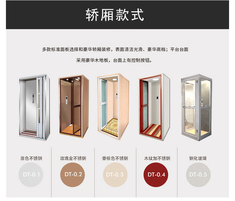 家用別墅電梯: 載重:200kg-500 kg 材質:304#鏡面/發紋不銹鋼--鋼化玻璃--鈦鎂合金--鈦金蝕刻 控制方式:數顯控制 售后:質保一年、終...