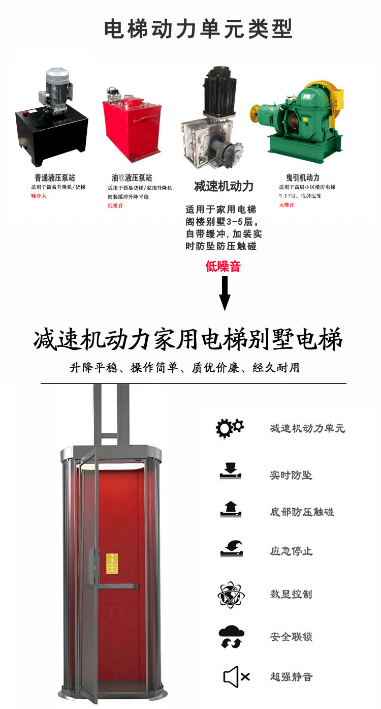 曳引家用電梯或別墅電梯:井道及地坑、轎廂、層站部分;主要部件:曳引系統、導向系統、門系統、轎廂、重量平衡系統、電器控制系統、安全保護系統,電氣方面的安全保護在電梯的各個運行環節都有,這種電梯同小區電梯相同。安靜平穩、價格經濟、乘坐舒適,方便殘疾人和老年人使用豪華高檔的家居電梯。