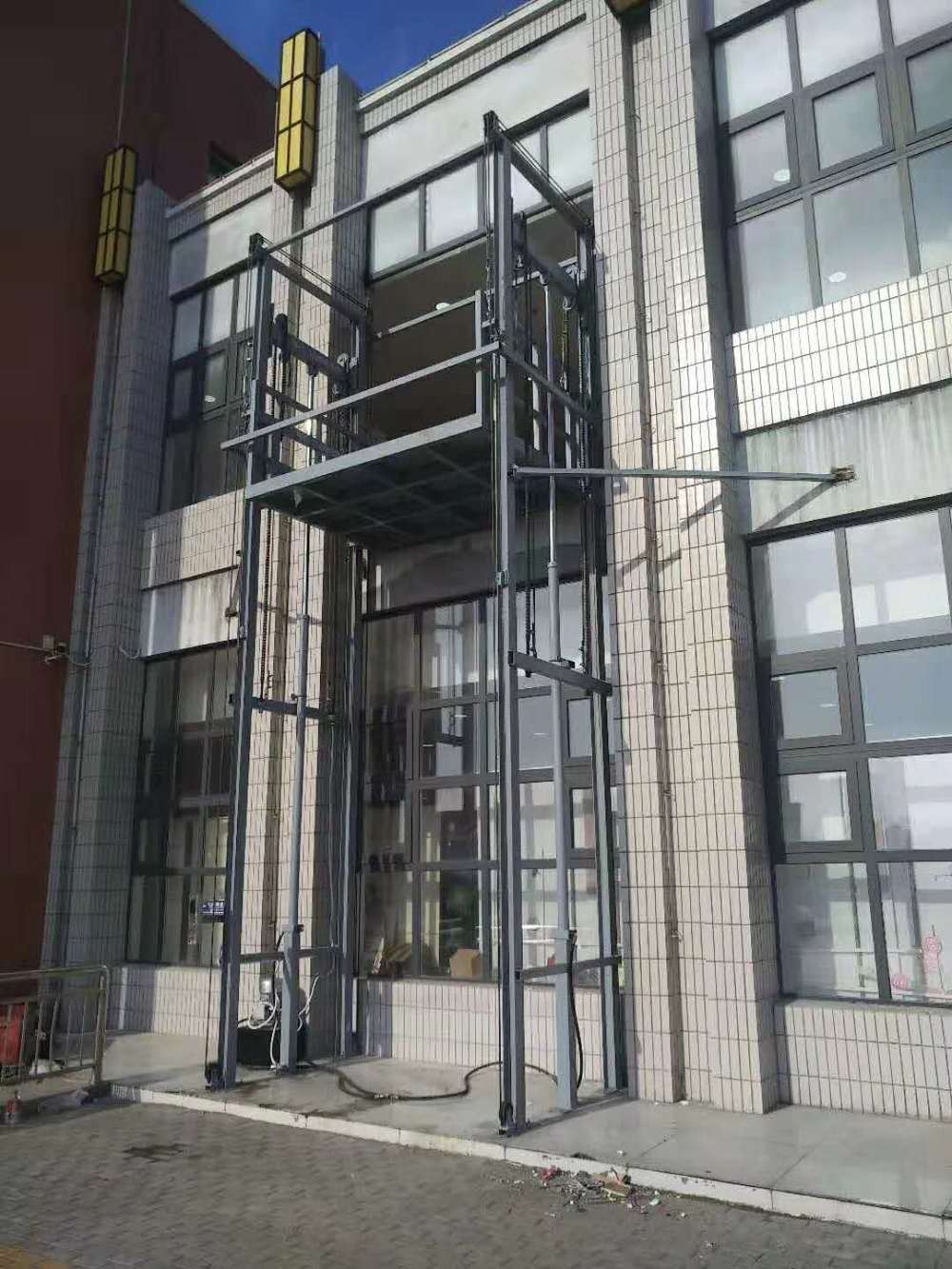 室外導軌式升降貨梯采用液壓油缸作為主要動力,通過重型鏈條和鋼絲繩傳動,室外升降貨梯,保證機器運行的安全。無需地坑和機房,特別適合于有地下室、倉庫改造、新建貨架等,具有安裝維修方便、美觀、安全、操作方便。為減小滾輪壓力,同時為了保障提升導軌式升降貨梯護欄有一定的防護高度,將上下導向滾輪距離設定為其結構范圍內的值,使物料平車有一定的導向高度,使車輪受力合理,運行更平穩。物料平車上裝有上、下側滾輪,能避免物料放置不對稱而使液壓升降機運行不穩。