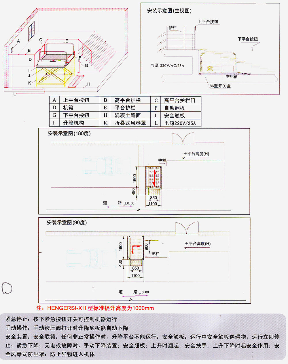 手動操作: 手動液壓閥打開,或手動旋動螺桿時升降底板能手動下降。